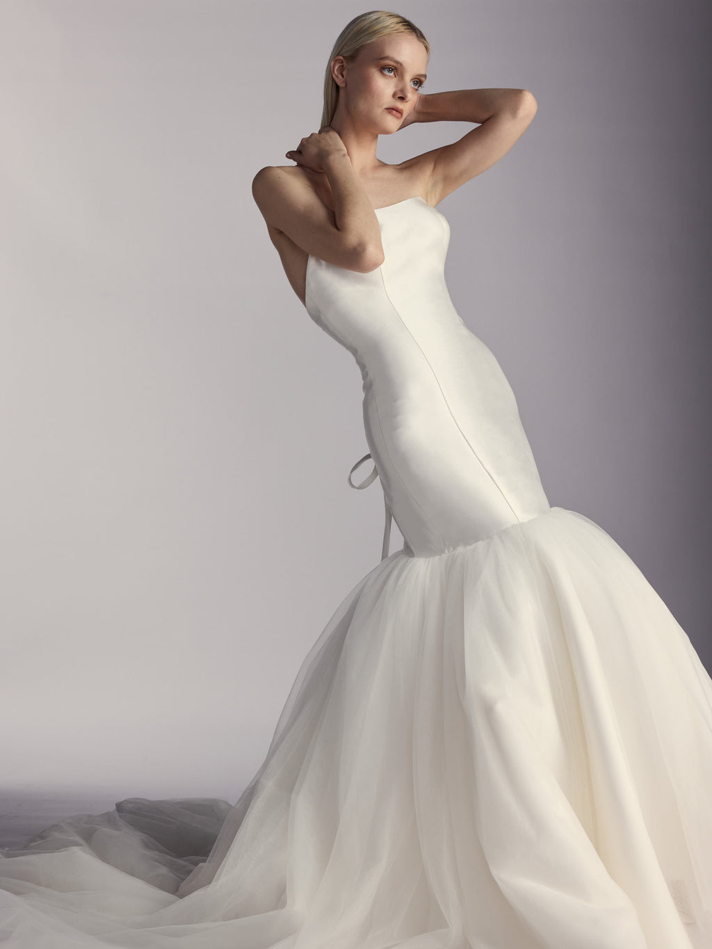 A sculpted strapless mermaid gown crafted in structured Mikado, defined by architectural seamwork and a clean, elongated silhouette. The fitted bodice releases into a soft tulle skirt, supported by a second layer of Mikado for structure and shape—balancing precision with movement in a modern expression of understated luxury.