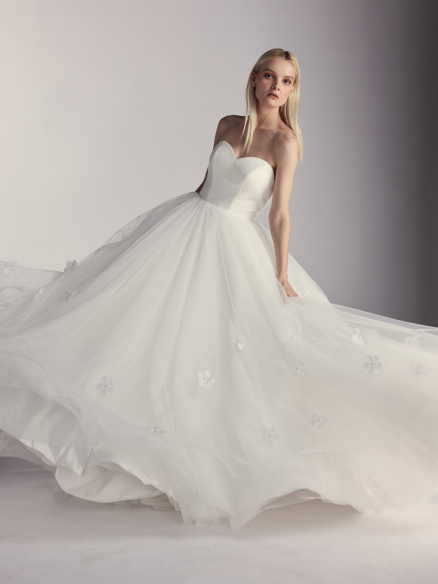 The strapless silhouette features a sculpted corset bodice with a subtle, light-catching shimmer, paired with a full skirt of fine tulle adorned with over seventy five-petal 3D florals crafted from true Italian silk organza and handmade in the United States. Finished with a concealed invisible zipper, Luméa moves with quiet elegance—light, romantic, and timeless.