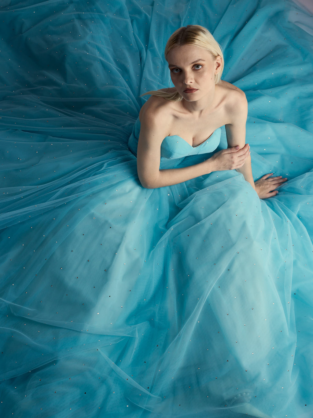 Crafted from Italian fine tulle in a soft baby blue hue, this sculptural ball gown is hand-embellished in Italy with thousands of authentic precision-cut European crystals, creating a refined celestial radiance. A structured corseted bodice balances the ethereal volume of the skirt. Finished with a concealed invisible zipper.
